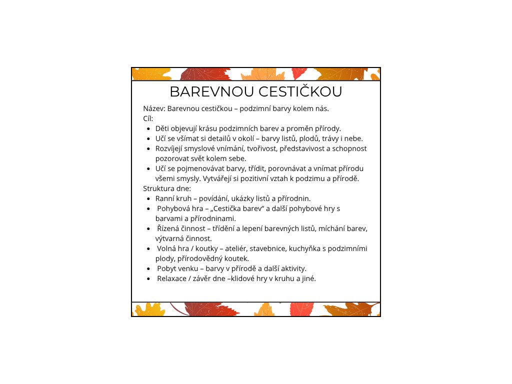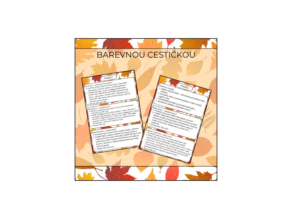 Podzim hraje všemi barvami – listy šustí pod nohama, kamínky se třpytí rosou a kapky deště zpívají svou písničku. Tento digitální materiál „Barevnou cestičkou“ vás provede týdnem plným pozorování, tvoření, pohybu a smyslového objevování. Děti se vydají po cestách z listů, kamínků i kapek vody a naučí se vnímat krásu podzimu očima, rukama i srdcem. Každý den přináší jinou část cesty – barvy, přírodu, hru i klid – které rozvíjejí tvořivost, zvídavost i vztah k přírodě.
