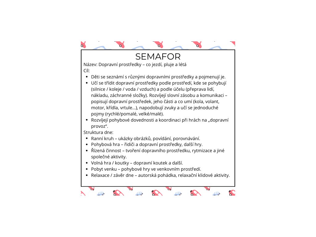 🚗 DOPRAVNÍ PROSTŘEDKY – JEZDÍME, PLUJEME, LÉTÁME (týdenní příprava do MŠ)