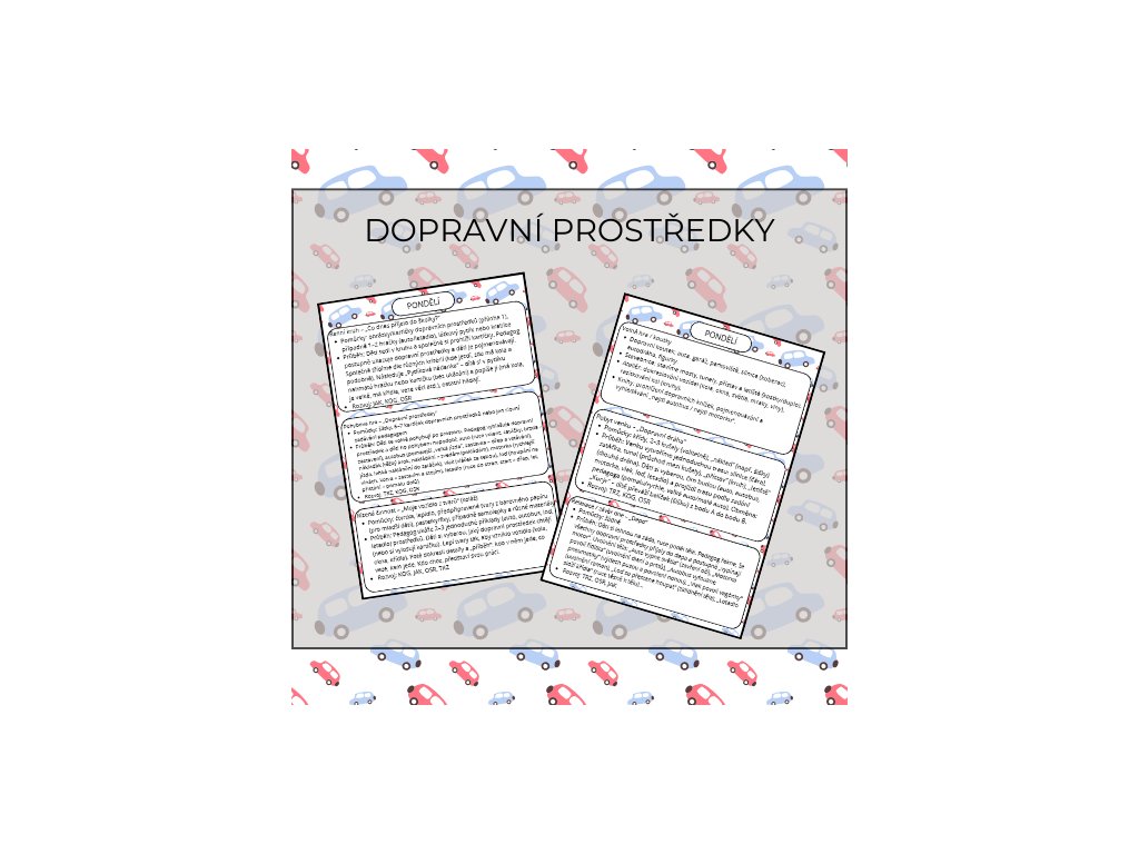 Týdenní tematická příprava „Dopravní prostředky“ je zaměřená na poznávání a prožitek světa dopravy – hravě, smysluplně a bez zbytečné přípravy navíc. Děti se seznámí s různými dopravními prostředky (auto, autobus, náklaďák, motorka, vlak, loď, letadlo), budou je třídit podle prostředí (silnice/koleje/voda/vzduch), porovnávat jejich vlastnosti a zkoušet je „na vlastní tělo“ v pohybových hrách. Týden je postavený na zážitku: badatelské pokusy s autíčky a povrchy, smyslohraní (myčka aut), míčové hry na náklaďák a balíčky, stavitelská výzva „most pro náklaďák“ a závěrečné opakování celého týdne formou sdílení i tiché pošty.
