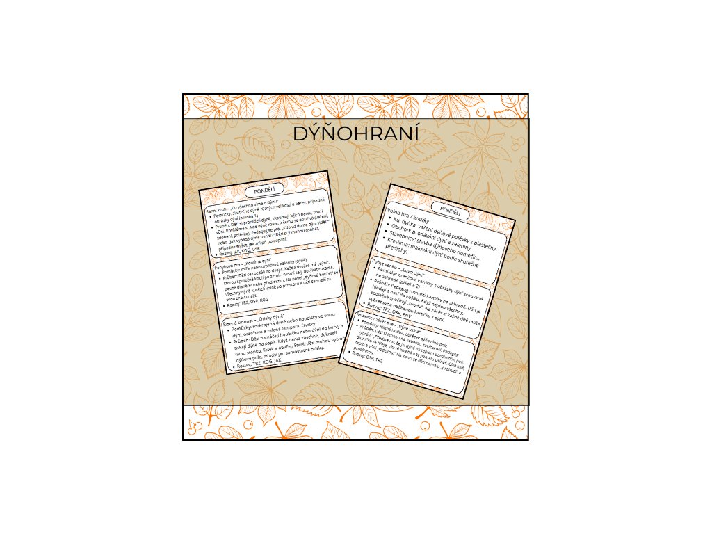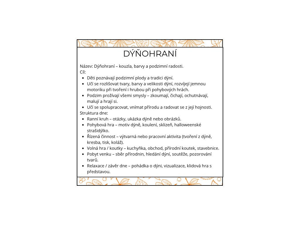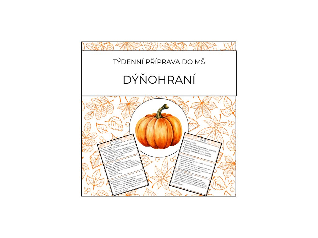 Podzim je časem oranžových tónů, voňavých dýní a kouzelné nálady. Tento digitální materiál „Dýňohraní“ vám nabídne ucelený program na celý týden, díky kterému děti hravou formou poznají dýni všemi smysly – dotykem, chutí, vůní i fantazií. Každý den přináší jiné dýňové dobrodružství, tvoření, pohyb i klidné zakončení dne.