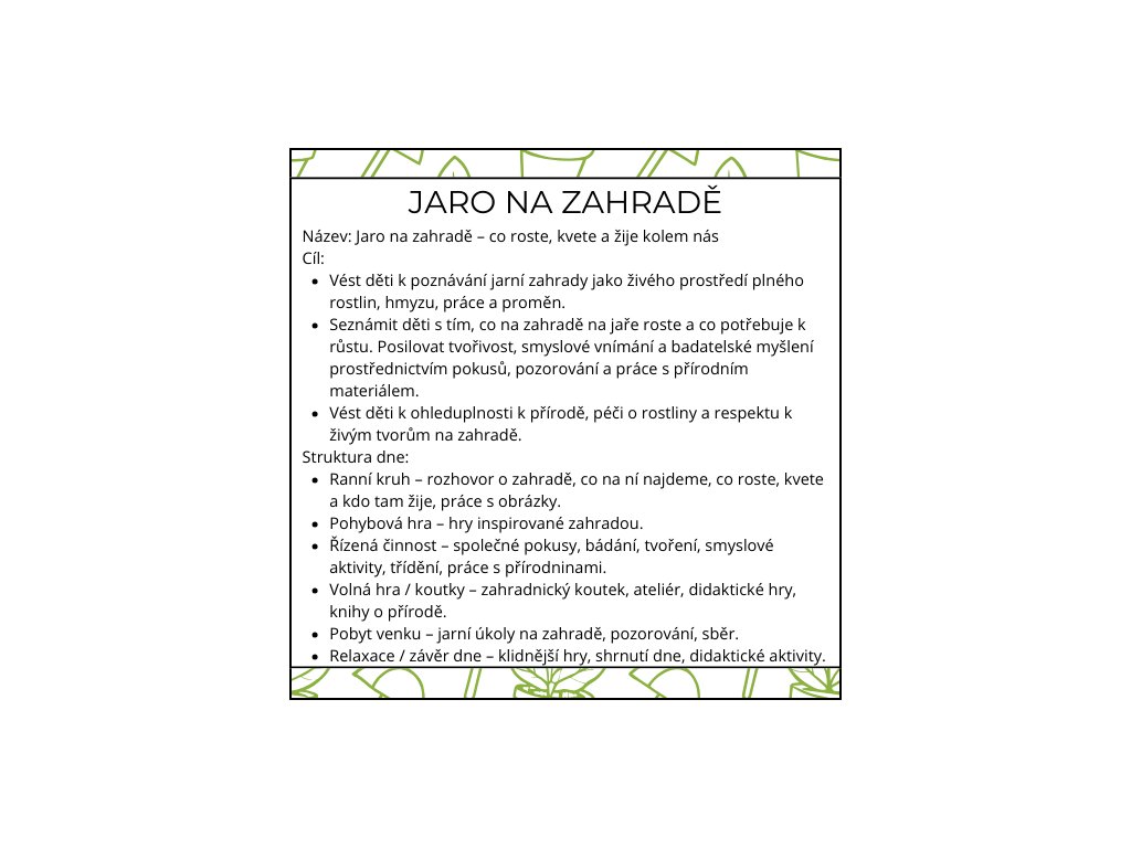 🟩 JARO NA ZAHRADĚ – týdenní příprava do MŠ (pondělí–pátek)