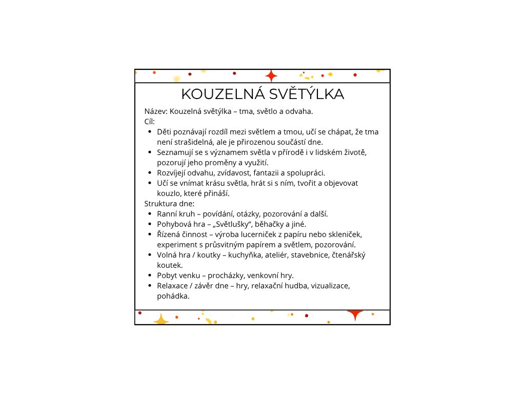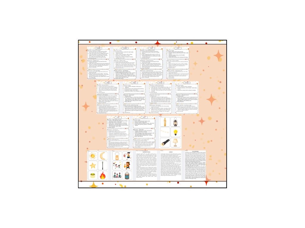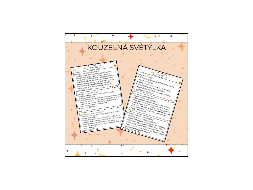 Podzimní dny se zkracují a svět kolem se pomalu halí do ticha a šera. A právě tehdy se objevují světýlka – malá, hřejivá a kouzelná. Tento digitální materiál „Kouzelná světýlka“ vám nabídne ucelený program na celý týden, díky kterému děti hravou a prožitkovou formou poznají světlo i tmu, lampionové průvody, světlušky i noční oblohu. Každý den přináší nové objevování, tvoření, pohyb i klidné chvilky se světlem, které dětem pomáhá porozumět světu a samým sobě.
