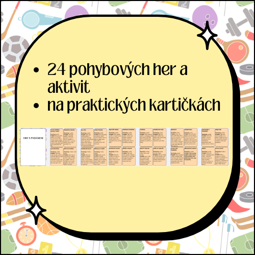 Tento soubor obsahuje celkem 24 pohybových her a aktivit ve formě PDF, které jsou zaměřené na “hry s padákem”. Všechny hry i aktivity jsou na praktických kartách. Jednotlivé aktivity tak můžeme vystřihnout a zalaminovat – poté využívat jednotlivě, popřípadě využívat celý soubor jako brožuru.