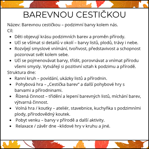 Podzim hraje všemi barvami – listy šustí pod nohama, kamínky se třpytí rosou a kapky deště zpívají svou písničku. Tento digitální materiál „Barevnou cestičkou“ vás provede týdnem plným pozorování, tvoření, pohybu a smyslového objevování. Děti se vydají po cestách z listů, kamínků i kapek vody a naučí se vnímat krásu podzimu očima, rukama i srdcem. Každý den přináší jinou část cesty – barvy, přírodu, hru i klid – které rozvíjejí tvořivost, zvídavost i vztah k přírodě.
