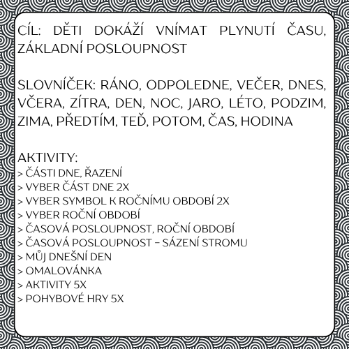 Téma „čas“ je jedno z 10 okruhů velkého souboru, který obsahuje dohromady 180 aktivit – Prematematický zásobník: https://uciteleucitelum.cz/material/matematika/pre-matematicky-zasobnik-pro-ms
