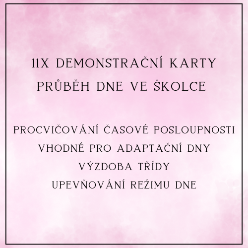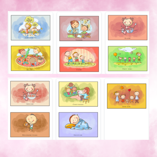 Demonstrační karty (11x) na téma „Jak to chodí ve školce?“ – časová/dějová posloupnost. Soubor zakoupíte ve formátu PDF, velikostně A4 (dvě demonstrační karty na jedné straně A4), následně lze snadno vytisknout. Pro delší životnost je vhodné po tisku materiál zalaminovat a vystřihnout.