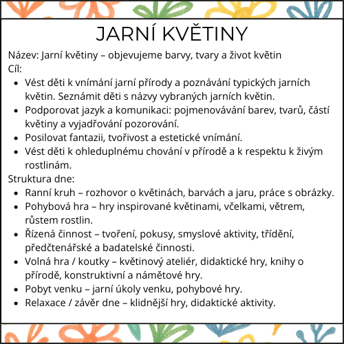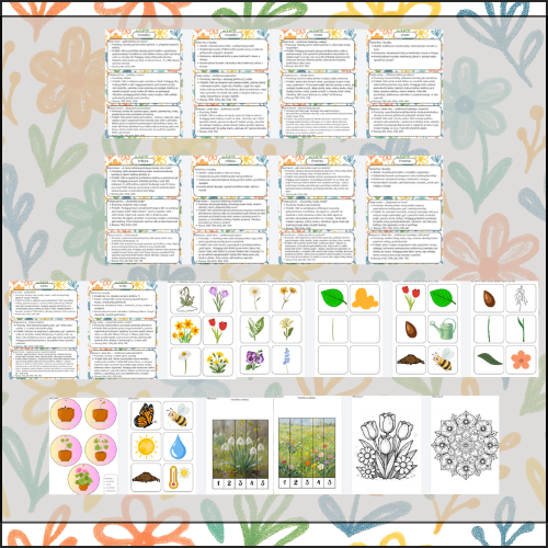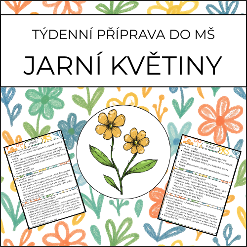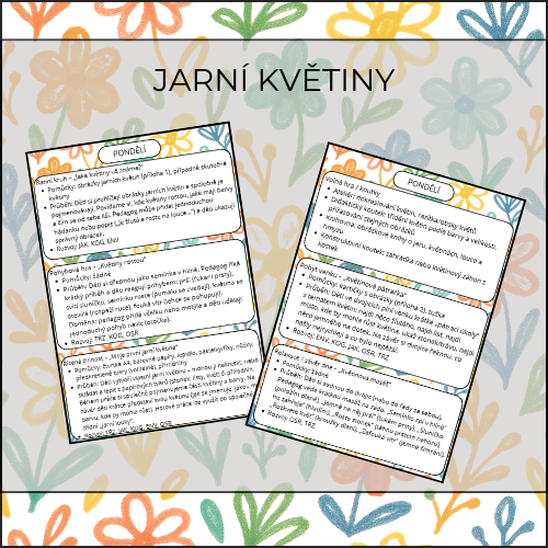 Týdenní tematická příprava „Jarní květiny“ vede děti k tomu, aby květiny nevnímaly jen jako „něco, co roste venku“, ale aby je skutečně poznávaly, zkoumaly a chápaly jejich význam v přírodě. Děti se během týdne seznamují s typickými jarními květinami, jejich barvami, tvary i částmi, objevují časovou posloupnost růstu květiny a poznávají, proč jsou pro květiny důležité včely a motýli. Týden je postavený na smysluplných aktivitách: společné pokusy, bádání, tvoření, smyslové činnosti, pohybové hry, venkovní aktivity i předčtenářské a jazykové hry. Nechybí třídní herbář, květinový záhon, opylovací pokus ani jemné závěrečné aktivity, které děti vedou k pozorování detailu a vztahu k přírodě.