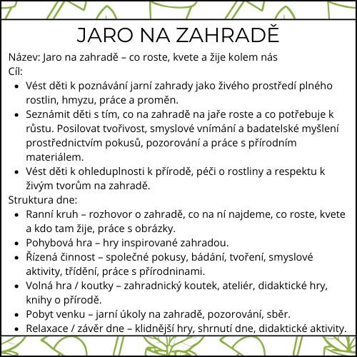 JARO NA ZAHRADĚ – týdenní příprava do MŠ (pondělí–pátek)