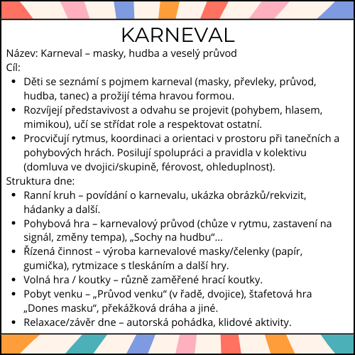 Řízené činnosti – výroba karnevalové masky, karnevalová kapela (rytmus/tleskání nebo jednoduché nástroje), krátké scénky a vystoupení, karnevalová stanoviště se snadnými úkoly.