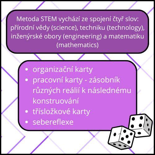 Tento vzdělávací soubor slouží jako zásobník aktivit, které se přímo pojí s metodou STEM učení. Vhodné je soubor vytisknout, karty vystřihnout a zalaminovat. Obsah celého 47 stránkového PDF souboru: