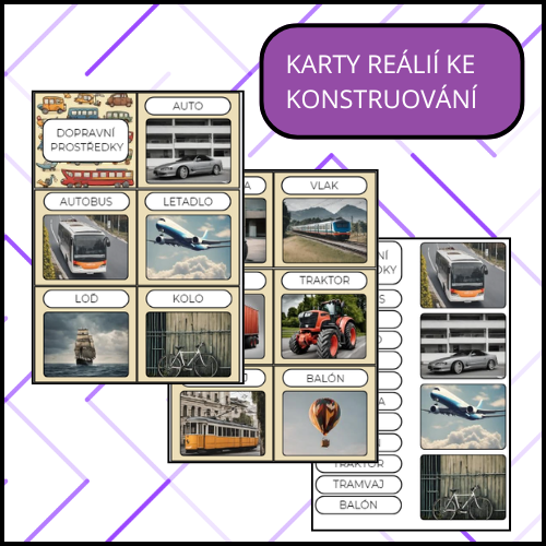 • V dokumentu jsou následně karty uspořádané dle různých 10 témat, které po vytisknutí zalaminujte a vložte do stejné krabičky, nebo spojte kroužkem. Vznikne vám tak zásobník různých reálií, které mohou děti konstruovat z různých předmětů. Děti mohou přiřazovat obrázky k dílům svých kamarádů – využití v dalších aktivitách.