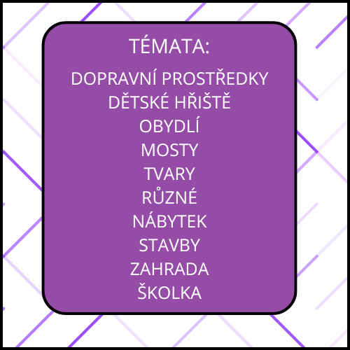Deset témat v tomto souboru: DOPRAVNÍ PROSTŘEDKY, DĚTSKÉ HŘIŠTĚ, OBYDLÍ, MOSTY, TVARY, RŮZNÉ, NÁBYTEK, STAVBY, ZAHRADA, ŠKOLKA