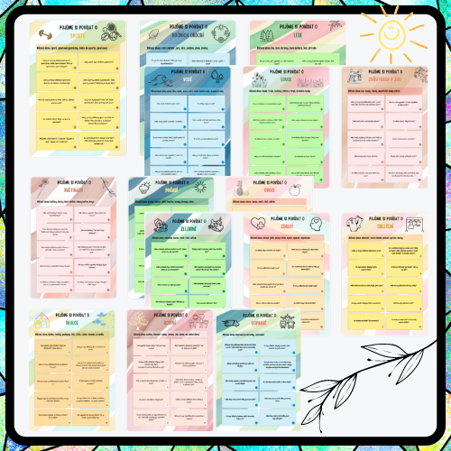 Konverzační karty jsou skvělým nástrojem pro pedagogy v mateřských školách a na prvním stupni základních škol. Tento zásobník netradičních i tradičních otázek na kartách je navržen tak, aby si ho pedagogové mohli snadno vytisknout, vystřihnout a poté využívat během řízené činnosti s dětmi. V souboru naleznete dohromady 15 témat a ke každému z nich 10 zajímavých otázek k rozvíjení konverzace a diskuze s dětmi. Témata: školka, rodina, sport, roční období, les, voda, louka, zoo, květiny, počasí, ovoce, zelenina, zdraví, oblečení, doprava.