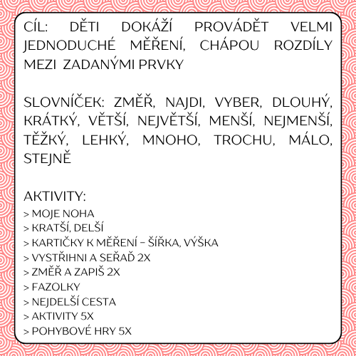 Téma „měření“ je jedno z 10 okruhů velkého souboru, který obsahuje dohromady 180 aktivit – Prematematický zásobník: https://uciteleucitelum.cz/material/matematika/pre-matematicky-zasobnik-pro-ms