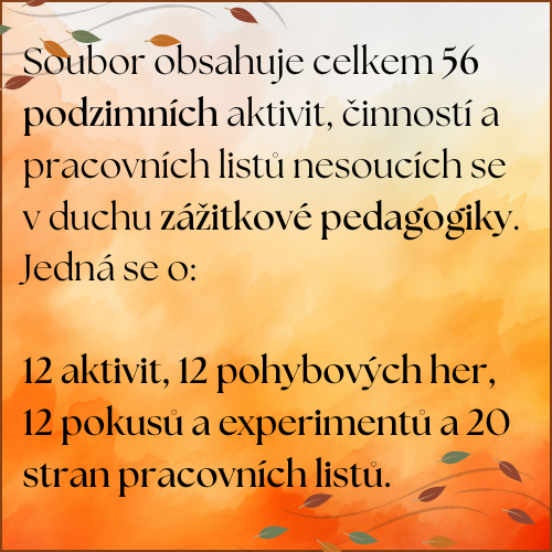 Soubor Podzim hravě je skvělým pomocníkem pro pedagogy, kteří chtějí dětem nabídnout pestré a smysluplné aktivity plné radosti a objevování.