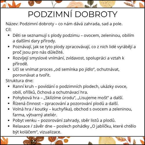 ✅ Ideální pro podzimní období – propojuje poznávání, tvoření, pohyb, smysly, emoce i radost z úrody.