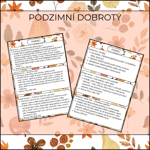 Podzim je plný chutí, vůní a barev. Zralá jablka, dýně, obilí i ořechy nám připomínají, že příroda dokončila svou práci a nabízí nám své dary. Tento digitální materiál „Podzimní dobroty“ vám nabídne ucelený program na celý týden, díky kterému děti hravou formou poznají, odkud pochází naše jídlo, jak se z plodů stávají dobroty, a proč je důležité si přírody vážit. Každý den přináší jiné objevování – smyslové hry, pohyb, tvoření i ochutnávání, které rozvíjí všechny dětské smysly, poznání i vděčnost za podzimní úrodu.
