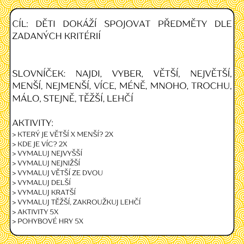 Téma porovnávání je jedno z 10 okruhů velkého souboru, který obsahuje dohromady 180 aktivit – Prematematický zásobník: https://uciteleucitelum.cz/material/matematika/pre-matematicky-zasobnik-pro-ms