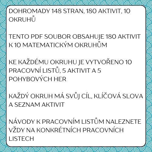 Tento soubor obsahuje na 148 stranách dohromady 180 aktivit, tematicky rozdělených do 10 matematických okruhů.