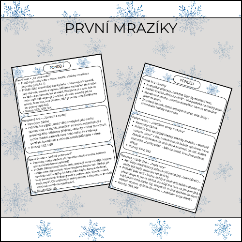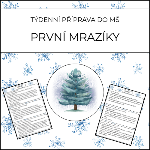 Když ráno křupne tráva pod botou a z úst se kouří, víme, že přišly první mrazíky. Děti s nimi bezpečně seznámíme – prozkoumají led, zjistí, jak se zahřát pohybem, jak pomoci zvířatům i jak si užít tiché kouzlo začínající zimy. Digitální materiál „První mrazíky“ přináší ucelený týden aktivit od zkoumání ledu přes výtvarné „mrazové“ techniky až po jednoduché pokusy a klidové rituály pro teplé ruce a klid v břiše.