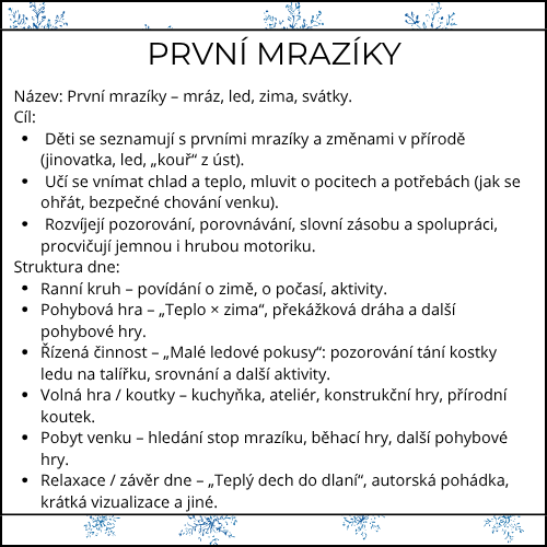 Řízené činnosti – ledové pozorování (sůl/teplá voda vs. nic), „malujeme mrazem“ (ledová malba, jinovatka se solí), jednoduché krmítko pro ptáčky (správná pravidla), páteční „ledové poklady“ – badatelský pokus.