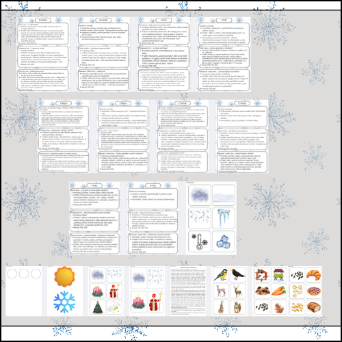 Volná hra / koutky – ateliér „okna zimy“, smyslový koutek teplo × chlad, kuchyňka „teplý nápoj“, konstrukční „teplé pelíšky“ a další.