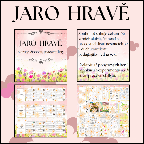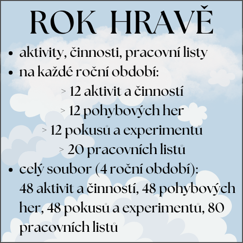 ROK HRAVĚ je unikátní balíček čtyř tematických souborů (Jaro, Léto, Podzim, Zima), který nabízí dohromady 224 pečlivě vytvořených aktivit pro děti ve věku 3–7 let. Celý soubor je v PDF formátu a po stažení naleznete v tomto jednom velkém PDF souboru celkem čtyři menší soubory (Jaro hravě, Léto hravě, Podzim hravě a Zima hravě).