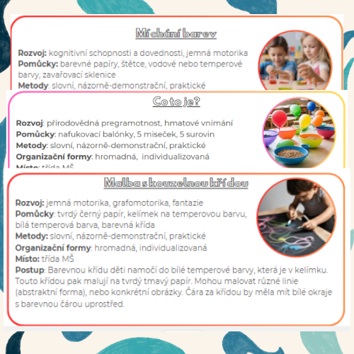 • Dítě a jeho tělo: rozvoj pohybových schopností a zdokonalování dovedností v oblasti jemné motoriky i hrubé motoriky