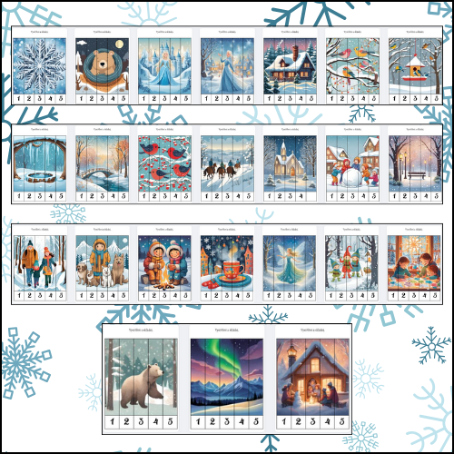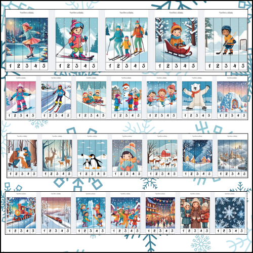 Tyto pracovních listy s krásnými zimními motivy jsou ideální pro děti předškolního věku. Obrázky si děti nejprve rozstříhají na pět dílů a poté je skládají zpět. Tato aktivita podporuje: