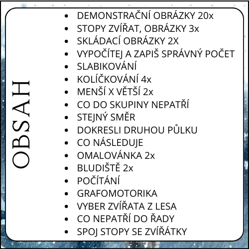 Sada obsahuje různé typy aktivit, které podporují rozvoj dětí v klíčových oblastech, jako je grafomotorika, matematická pregramotnost nebo tvořivé myšlení. Konkrétně zde najdete: