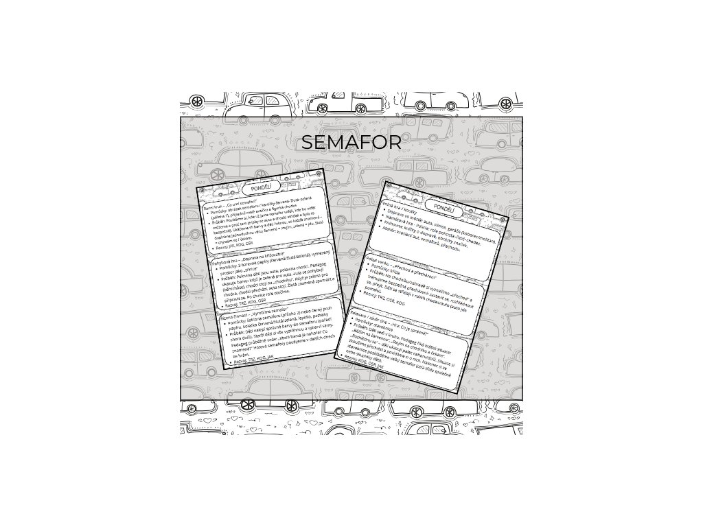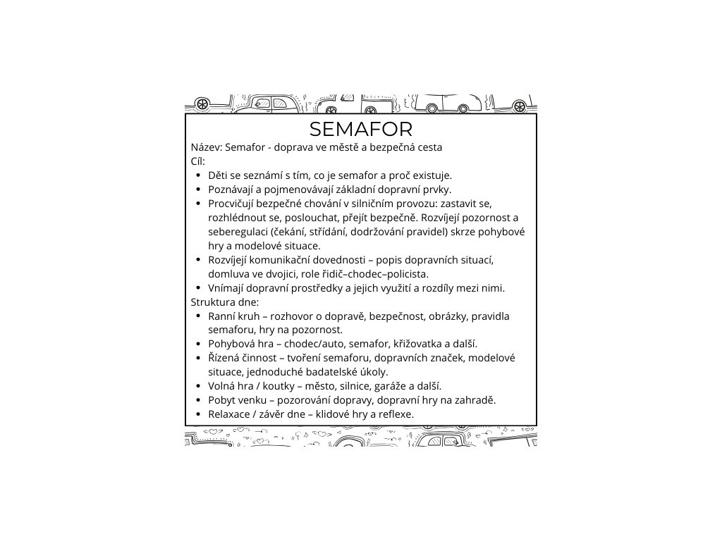 Týdenní tematická příprava „Semafor“ je zaměřená na bezpečné chování dětí v silničním provozu – srozumitelně, prakticky a hravě. Děti se naučí, co znamenají barvy semaforu, jak správně přecházet po zebře, proč je důležité rozhlížení a jak se chovat jako chodec. Týden je postavený na prožitku: nácvik situací, pohybové hry, role chodec–policie–řidič, výrobek reflexního náramku i závěrečné opakování celého týdne.