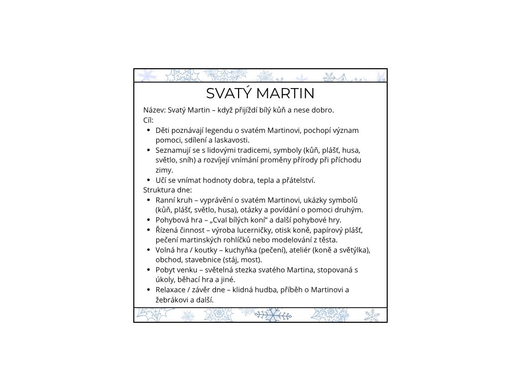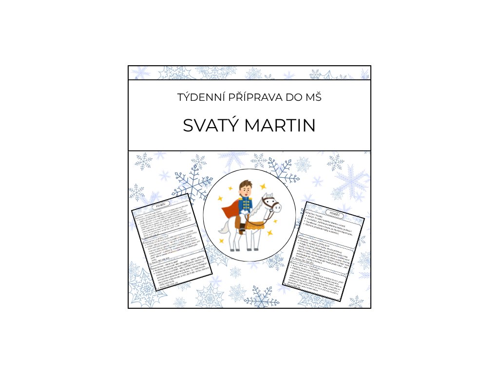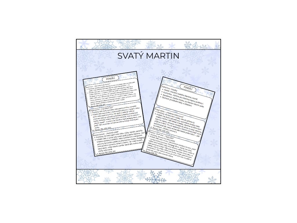 Listopad přináší první mrazíky, vůni pečených rohlíčků a světlo svíček. V tomto čase přichází svatý Martin – jezdec na bílém koni, který přináší nejen první sníh, ale i poselství dobra, pomoci a sdílení. Tento digitální materiál „Svatý Martin“ vám nabídne ucelený program na celý týden, díky kterému děti hravou a citlivou formou poznají legendu o svatém Martinovi, její význam a tradiční zvyky. Každý den přináší jiné objevování – vyprávění, pohyb, tvoření i malé slavnostní chvíle, které rozvíjejí empatii, spolupráci i vděčnost.