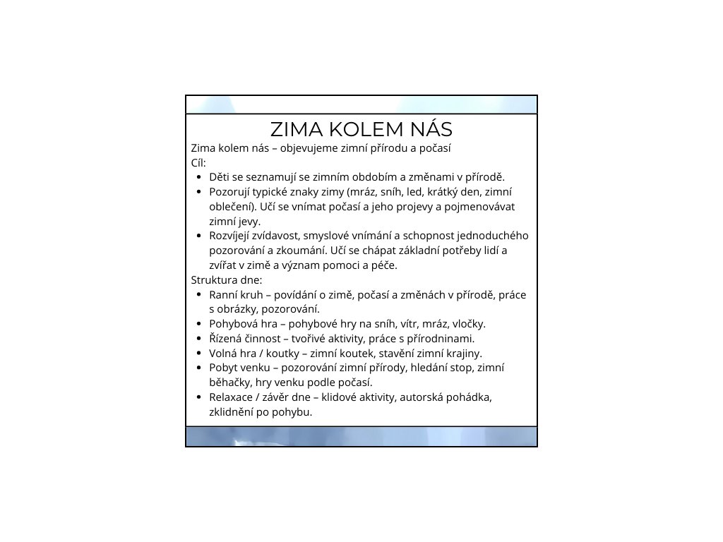 ✅ Ideální pro zimní období – propojuje pozorování, přírodu, pohyb, tvoření i klid, aby děti zimu opravdu pochopily a prožily „kolem nás“.